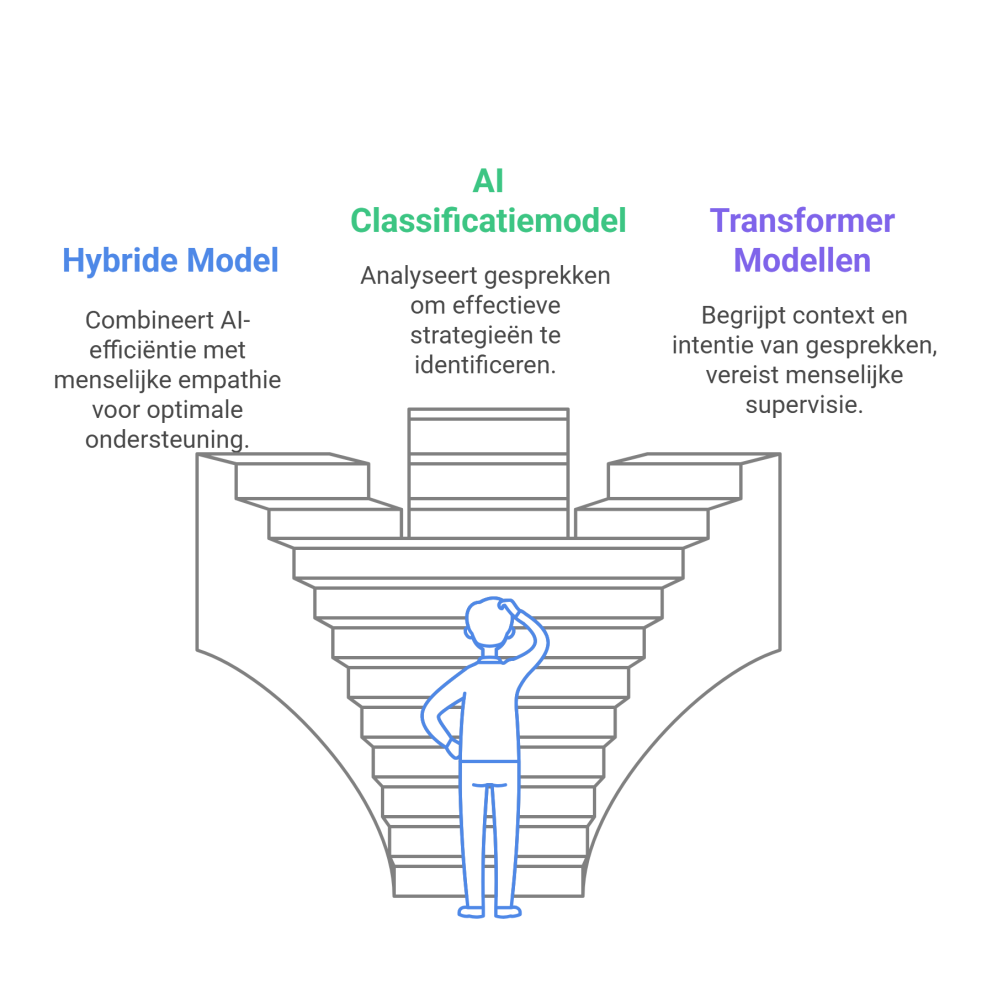 Een ander belangrijk punt uit het proefschrift was de ontwikkeling van een AI-gebaseerd classificatiemodel voor het analyseren van de effectiviteit van gesprekken. Door gebruik te maken van machine learning-technieken werden gespreksfragmenten geanalyseerd en gecategoriseerd op basis van hun impact. Hierdoor kon worden vastgesteld welke gespreksstrategieën bijdroegen aan een positieve verandering in de gemoedstoestand van de hulpzoekende.