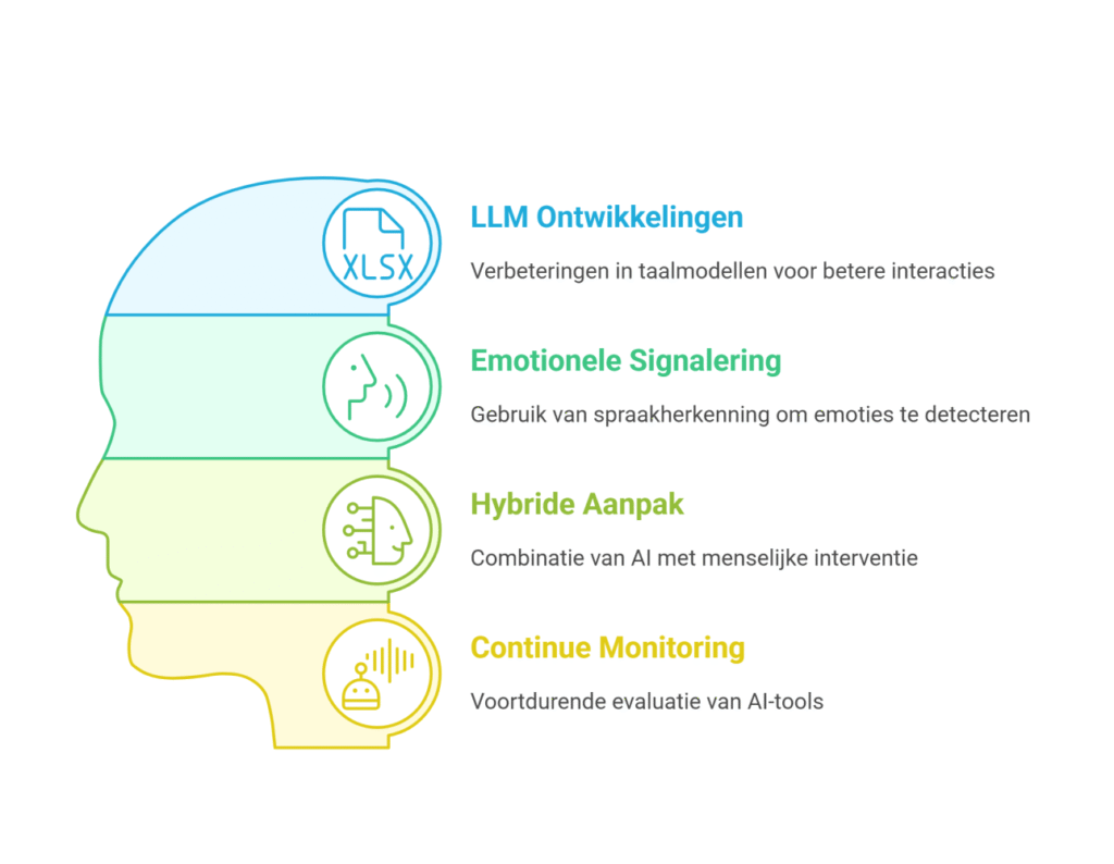 Tegelijkertijd blijft een hybride aanpak essentieel: AI moet worden ingezet als hulpmiddel, niet als vervanger van menselijke hulpverleners. Door voortdurende monitoring en bijsturing kan AI een waardevolle bijdrage leveren aan effectievere en efficiëntere hulpverlening.
